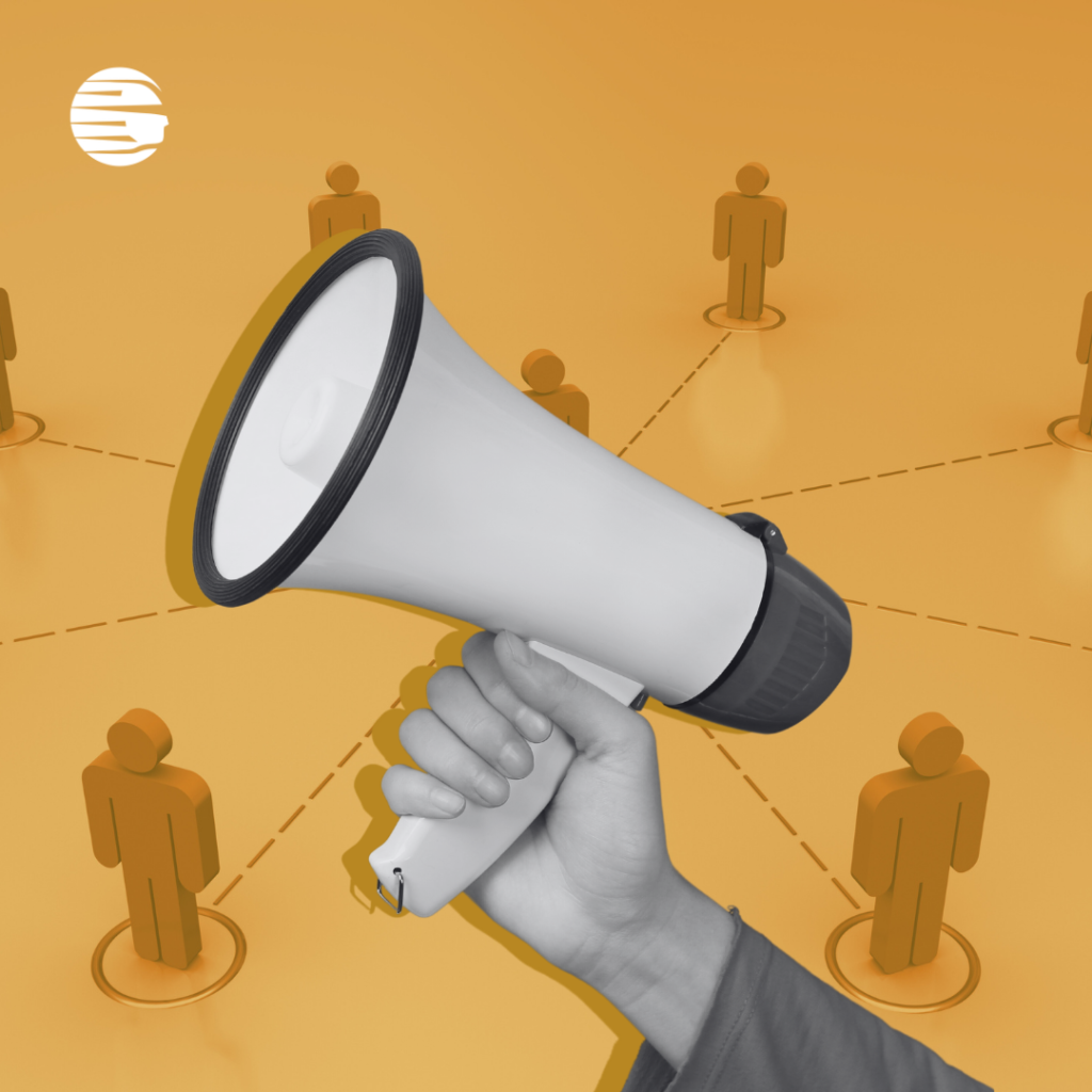Ao fundo, em amarelo, uma imagem de uma rede de pessoas interligadas entre si. No primeiro plano, ao centro, a imagem de uma mão segurando um megafone em preto e branco.